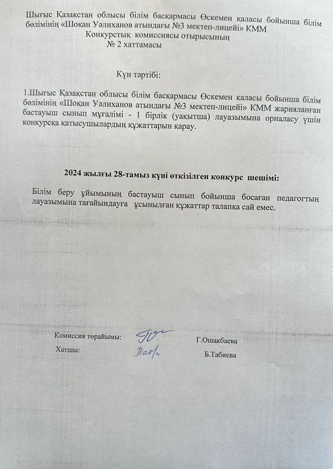 28 август 2024 0 1 2 3 4 5 "Шоқан Уәлиханов атындағы №3 мектеп-лицейі" КММ. "Шоқан Уәлиханов атындағы №3 мектеп-лицейі" КММ. Конкурстық комиссиясы отырысының №2 хаттамасы