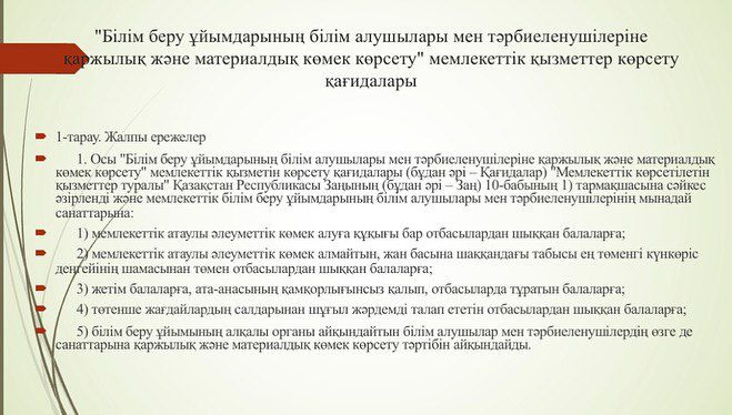 "Білім беру ұйымдарының білім алушылары мен тәрбиеленушілеріне қаржылық және материалдық көмек көрсету" мемлекеттік қызметтер көрсету қағидалары