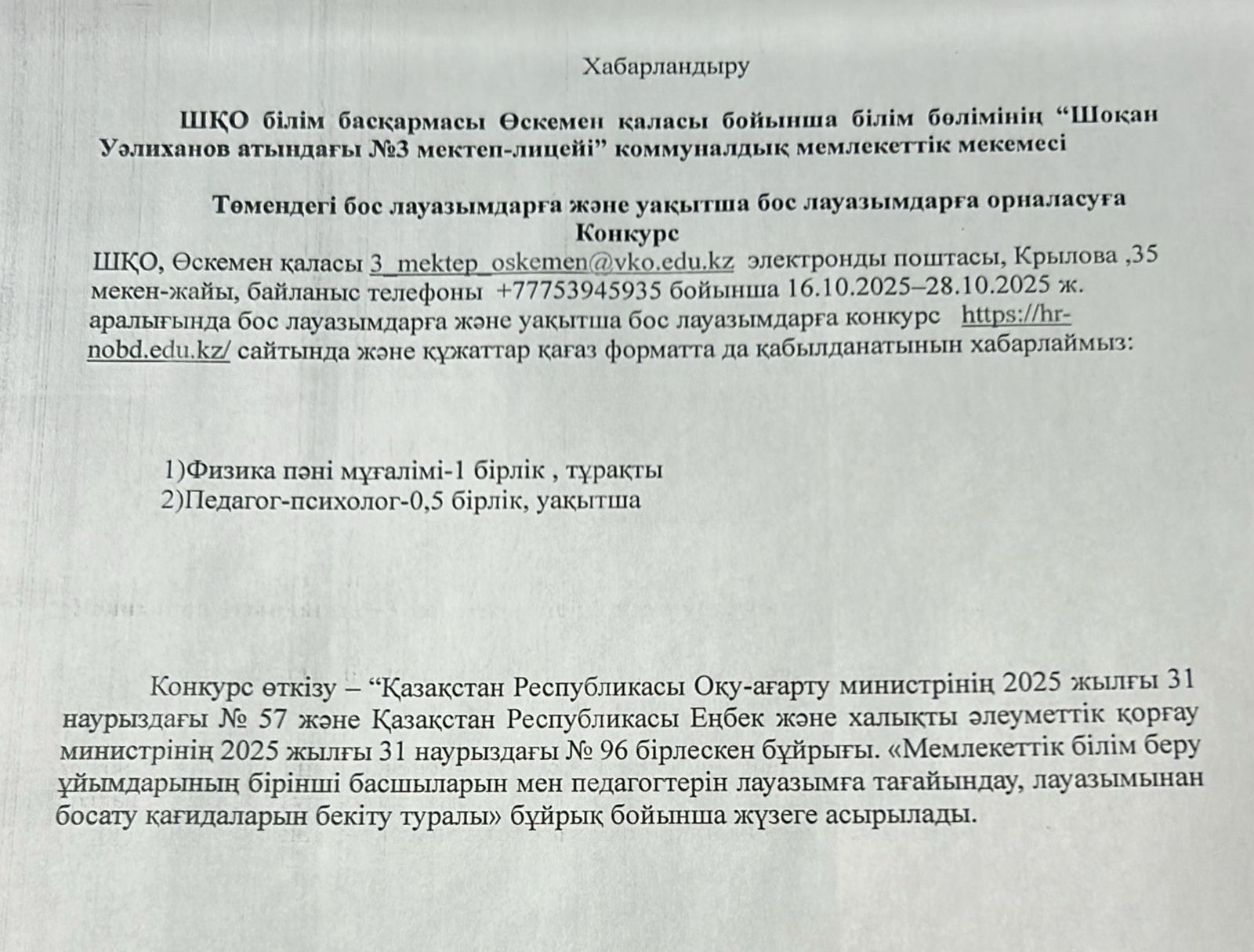 Бос лауазымдарға және уақытша бос лауазымдарға орналасуға Конкурс