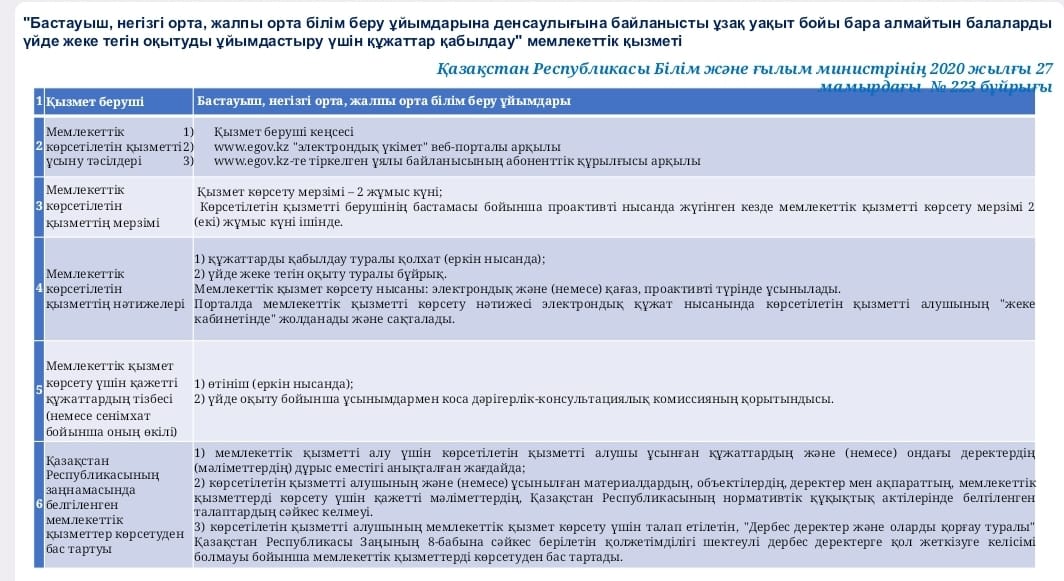 "Бастауыш, негізгі орта, жалпы орта білім беру ұйымдарына денсаулығына байланысты ұзақ уақыт бойы бара алмайтын балаларды үйде жеке тегін оқытуды ұйымдастыру үшін құжаттар қабылдау" мемлекеттік қызметі
